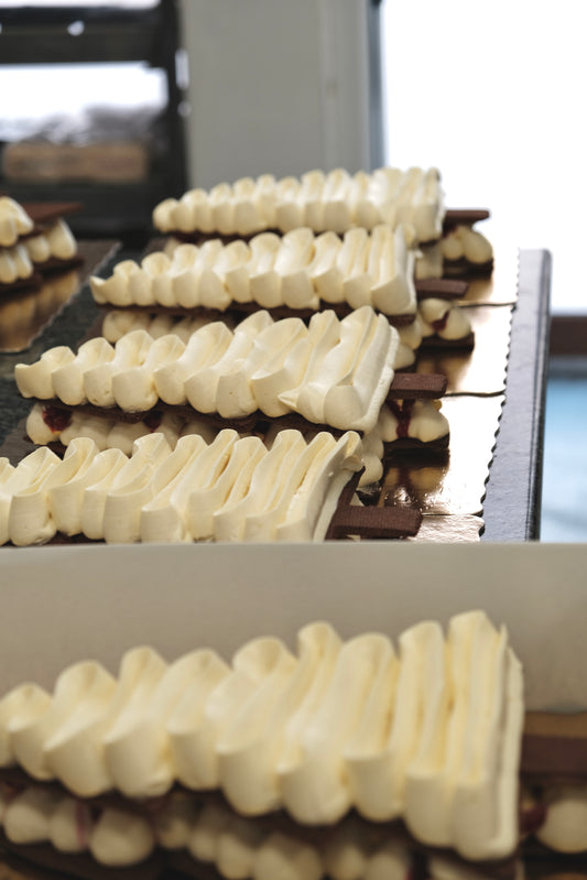1. Mascarpone, ciocolată albă, cremeux lămâie, zmeură, jeleu zmeură